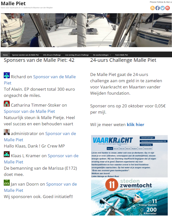 Op 19 en 20 oktober zeilt de Malle Piet de 24 uurs challenge. Doel is om 150 Mijl (1,852 x 150 = 277,8 Kilometer) te varen wat een theoretische snelheid van 6,26 Mijl per uur.