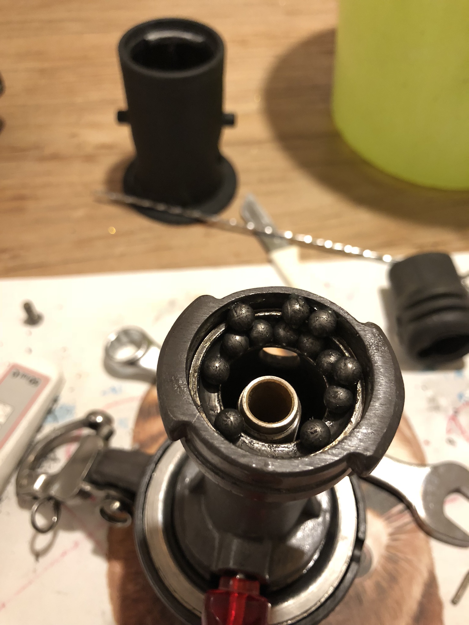 Tijdens het opruimen van de voorbak werden er kogellagertjes aangetroffen. Dat is over het algemeen geen goed bericht. Bij nader onderzoek bleek dat er kogeltjes uit de furlex waren gevallen. Alles is te repareren alleen van belang is weten waarom er kogeltjes uit de furlex konden komen en wat de oorzaak daarvan is. Er zat dus niet anders op dan de spullenboel uit elkaar te halen.