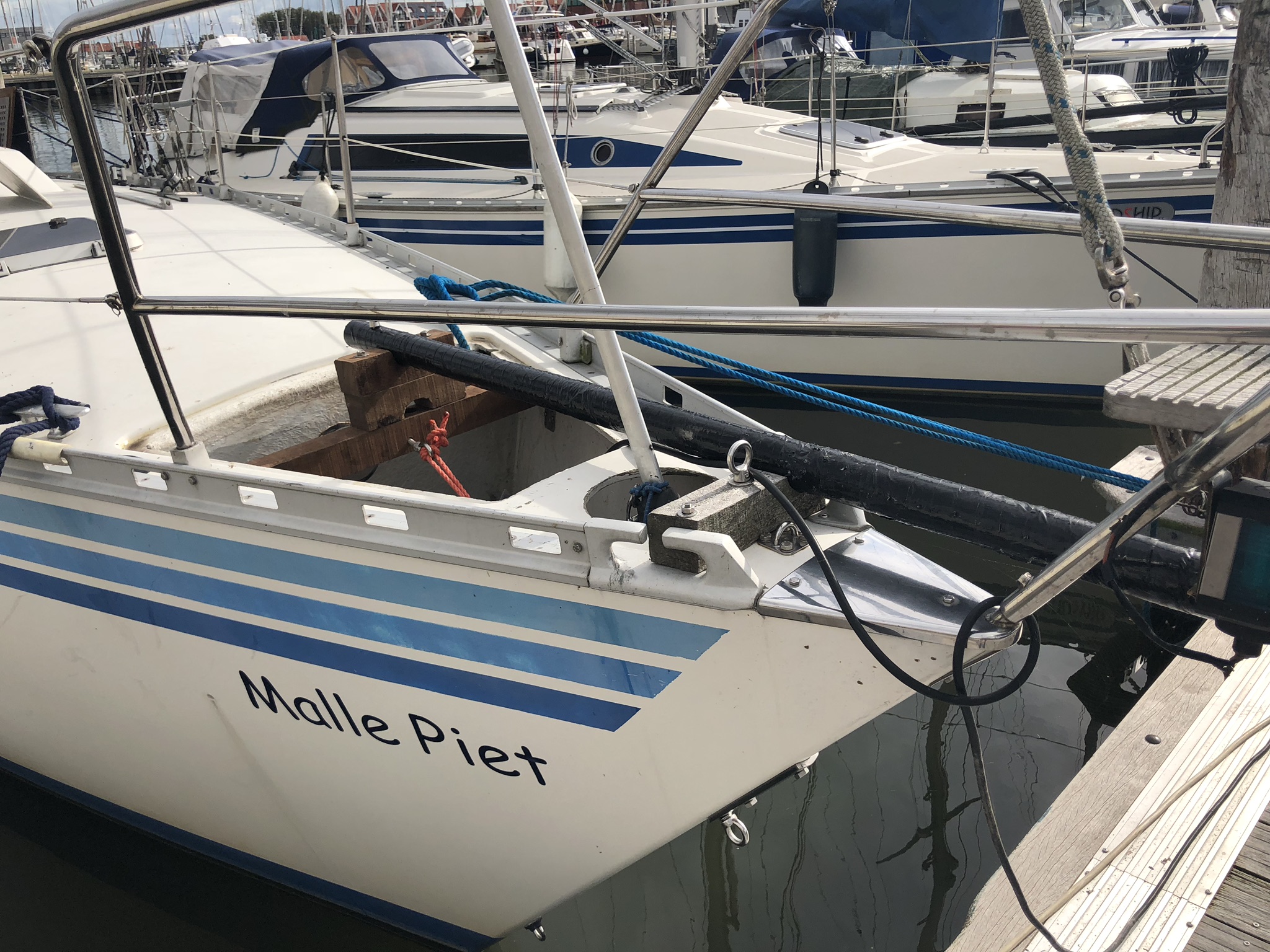 Onderstaand wat foto’s van de bouw van de boegspriet. Ik heb daarvoor een mast van een surfplank gebruikt, gevuld met staaldraad en polyester….